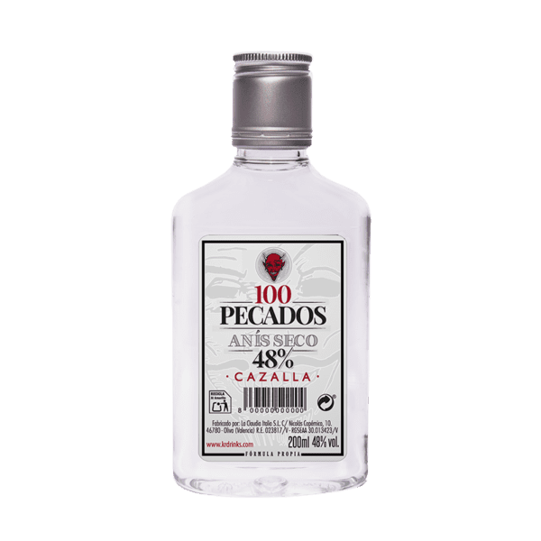 100 Pecados Cazalla. Es un anís seco de gran aroma e intenso sabor. Formatos PET 500ml, 350ml, 200ml, 100ml, 50ml. Receta propia. Anís seco de elaboración y receta propia. La cazalla es una bebida alcohólica típica valenciana derivada de la destilación del anís.